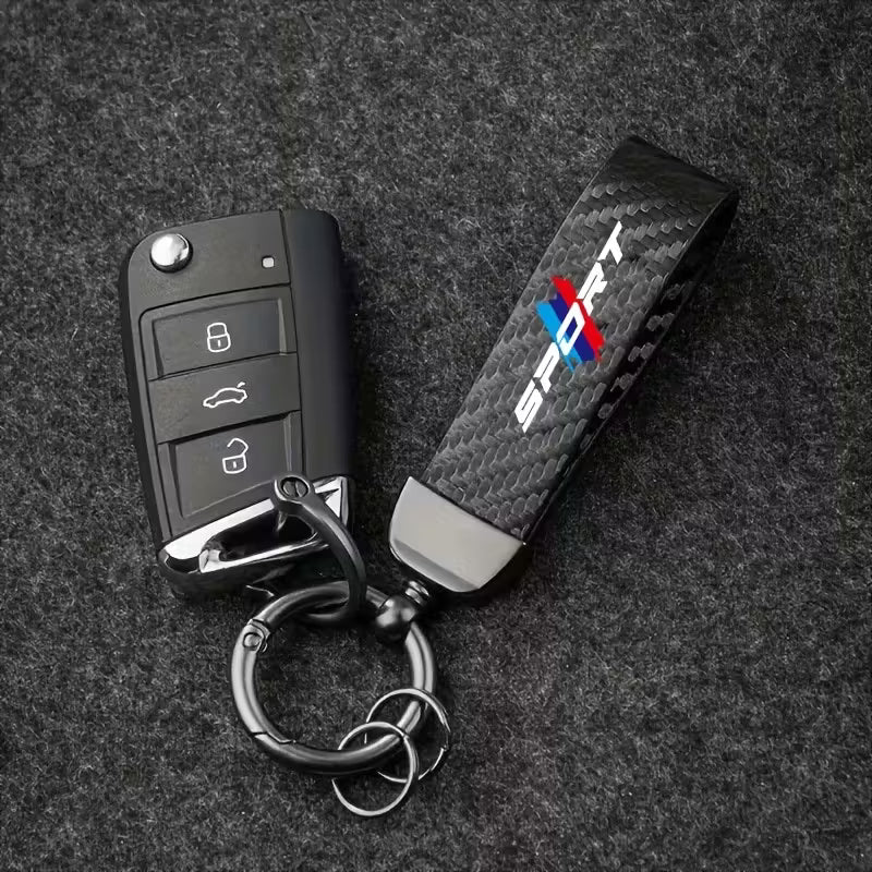 Elegant och hållbar nyckelring i kolfiberdesign, perfekt för bilnycklar. Tillverkad i slitstark zinklegering och PU-läder för en exklusiv känsla och lång livslängd. Den repbeständiga ytan och anti-förlust designen gör att dina nycklar alltid sitter säkert. Passar utmärkt till BMW men fungerar lika bra för alla bilmärken.